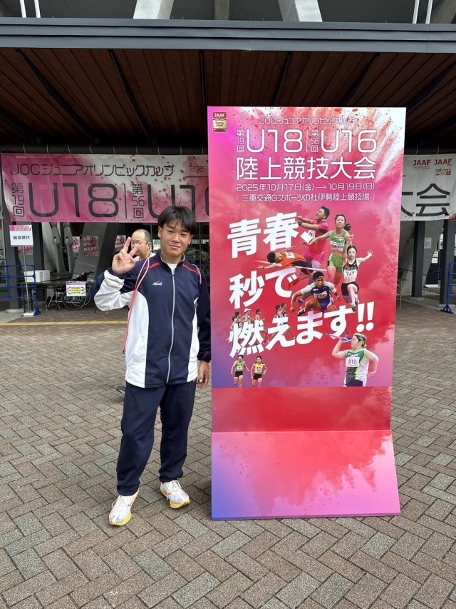 日本陸上競技連盟主催の第19回U18・第56回U16陸上競技大会(JOCジュニアオリンピックカップ)が18日三重交通Gスポーツの杜伊勢陸上競技場で行われ、本校3年の松本将翔君がU16男子ジャベリックスロー決勝に初出場し、57メートル77センチを記録し19位と健闘しました。