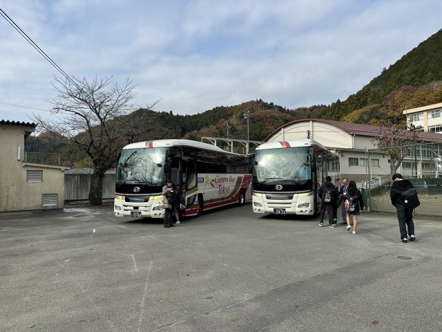 本校の指定会場は今年度、八王子桑志高校。今年は東京都が恩方中学校は遠隔地支援の対象校として指定したために、東京都が手配したバスによる送迎が行われました。