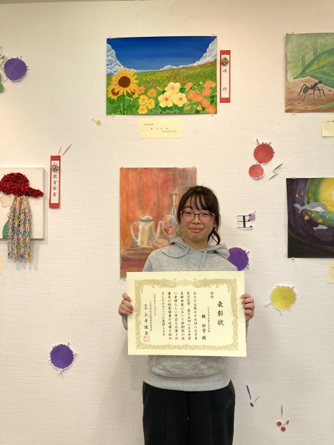 第75回八王子市民文化祭の中で実施された第15回八王子中学生絵画展において今年度も以下の2名が入選しました。30日に八王子市教育委員会の安間教育長出席のもとで表彰式が行われました。恩方カルチャークラブの一つとして活動をしている美術部ですが、しっかりと活動の実績を残しており立派だと思います。