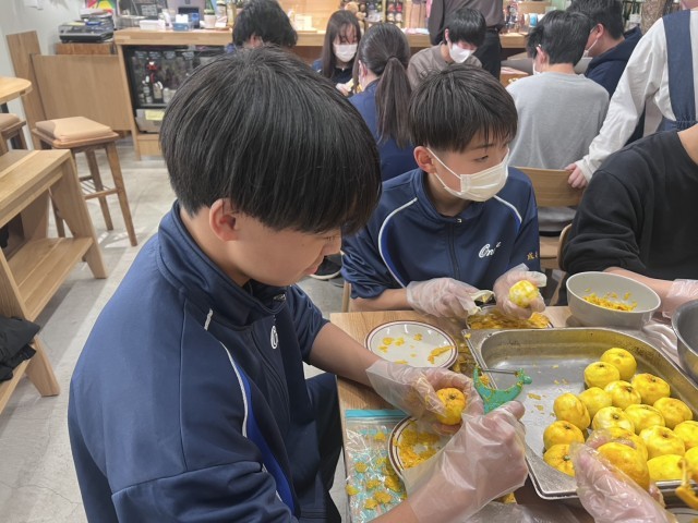 今回、本校恩方カルチャークラブの有志と聖パウロ学園高校の生徒が収穫した恩方産のゆずの皮むきを行いました。このゆずは地元で有名な高尾ビールさんの協力のもとで地産地消の恩方産ゆず風味のビールに加工されることになります。