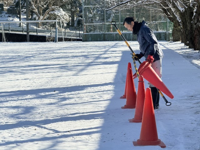 用務主事の赤坂さんは、昨日から除雪を行い校内はすべて融雪された状態で生徒たちを迎えることができました。校庭は真っ白な雪景色となっています。