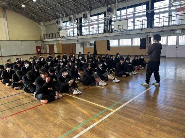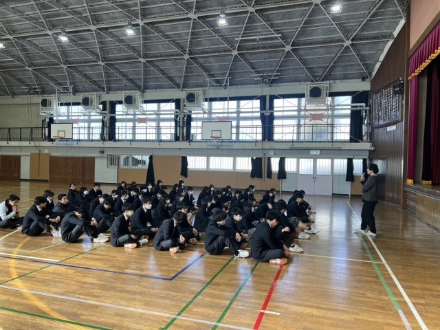 3年生が私立一般入試前の学年集会を行い、金光学年主任から受験に臨む仲間ヘの配慮と残りの中学生活の過ごし方への諸注意がありました。