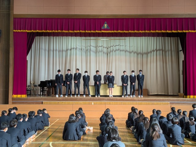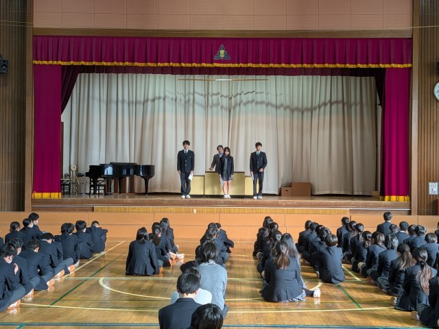 2月度生徒会朝礼が行われ、生徒会より目安箱に寄せられた回答や各種委員会からの報告や表彰などが行われました。