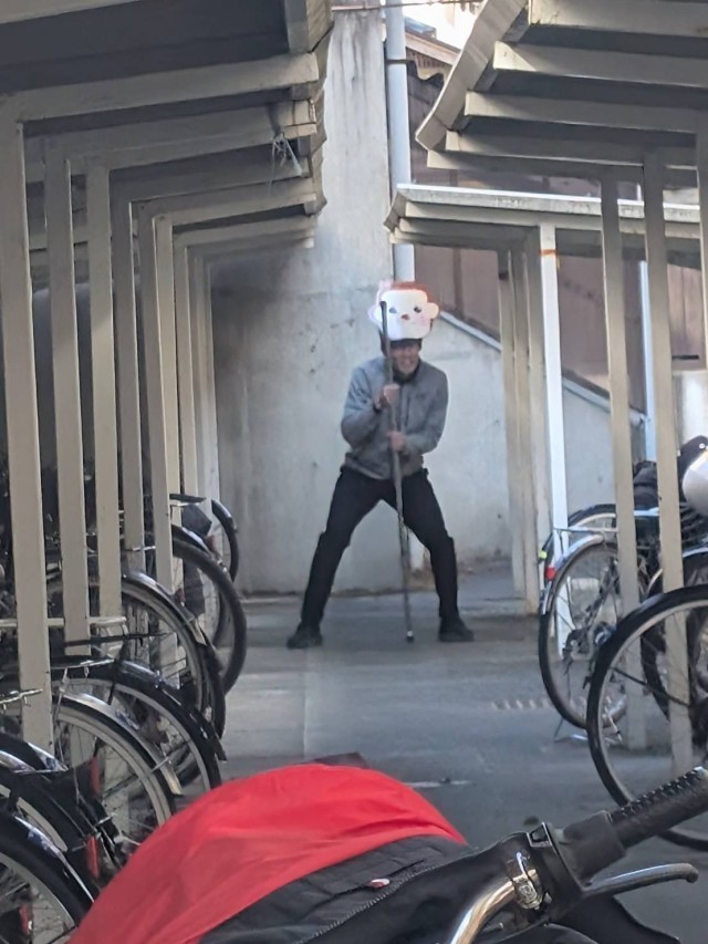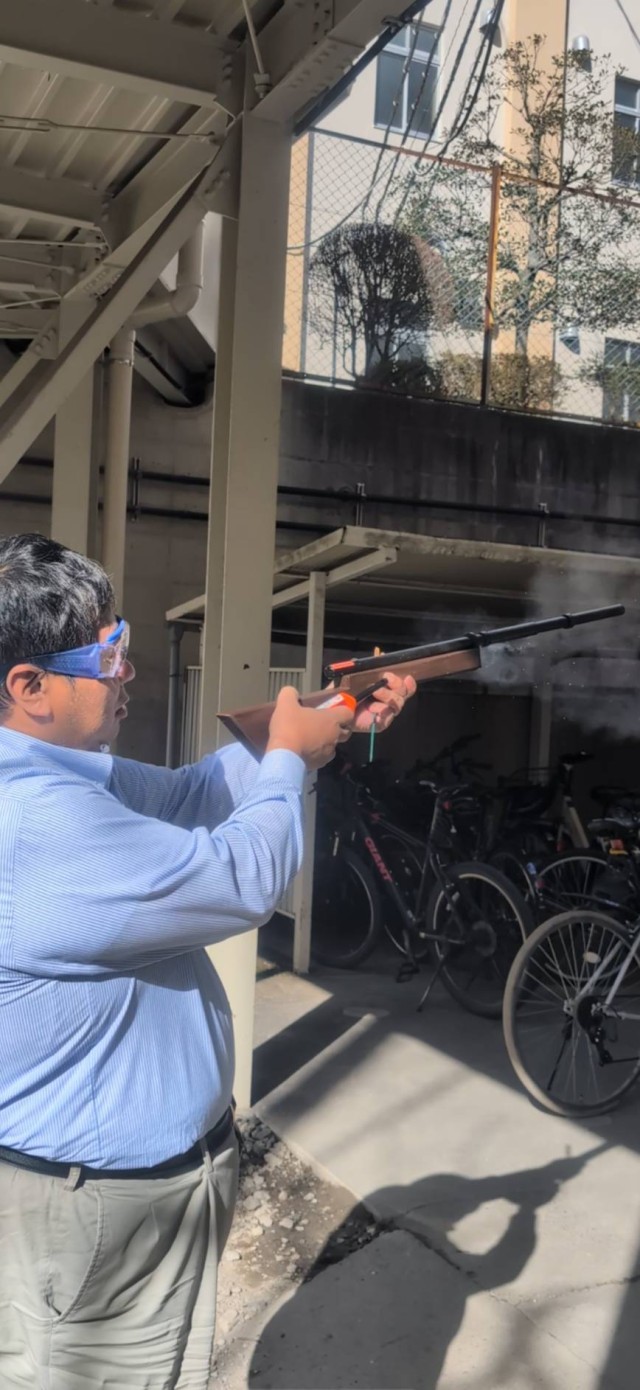 教員が猿役を行い、生徒を教室で退避させ「騒がず」「刺激せず」「速やかに」を合言葉に行動を行い、猿を山に戻すことを行う訓練です。猿への対応は教員が行い、市獣害対策課から支給された爆竹類を使用して、透明なコンパネを使用して山に誘導を行う訓練となります。以前に獣害対策を専門に行うEGOからの指導を元に、猿役の小林先生が迫真の演技で先生との本番を想定した取り組みを確認しました。