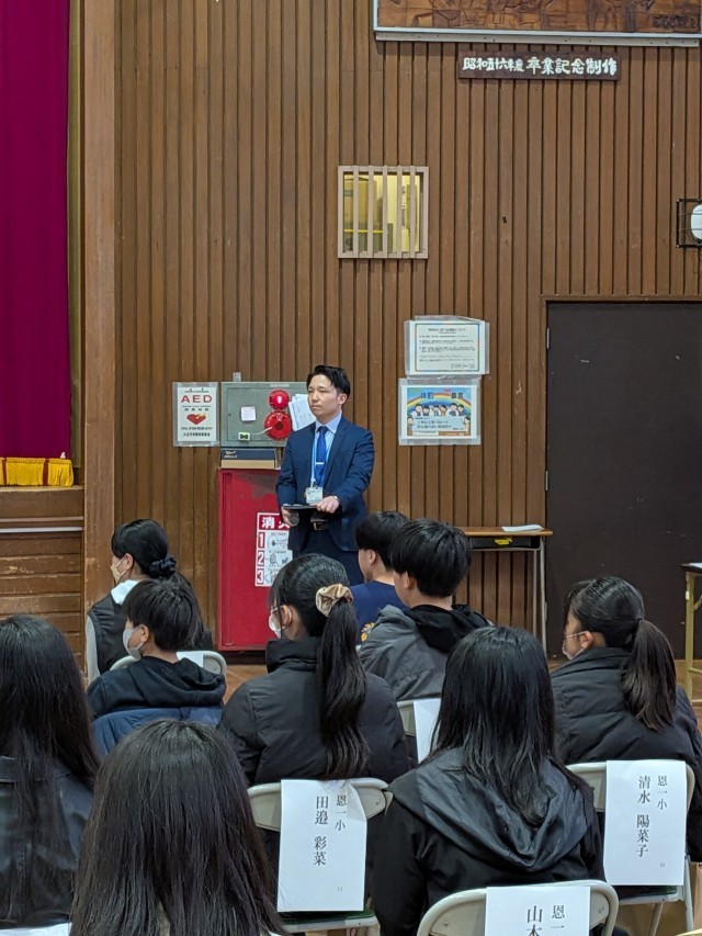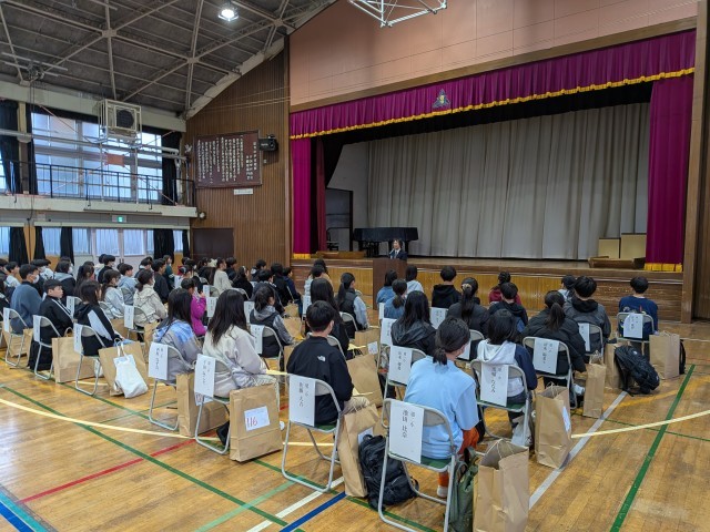 校長先生からの歓迎の言葉の後に太田教務主任から中学校の学習についての説明があり、秋守生活指導主任代理から恩方中学校の生活と入学式当日の服装や持ち物などについて注意事項がありました。また、副校長から最後に「皆さんは恩方中学校に来てラッキーです。恩方中学校でしか経験できないことを大切に大人になるための義務教育最終段階を貴重なものに」との激励で集会を終了しました。