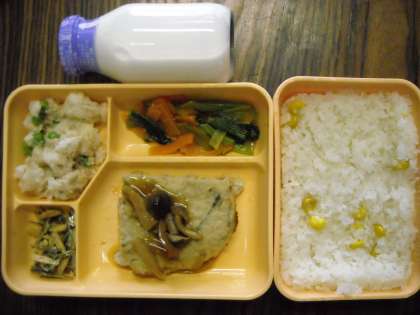 コーンライス・和風ハンバーグ・野菜のソテー・ツナじゃが・ごまめナッツ