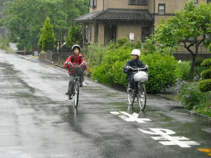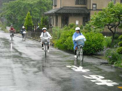 断続的に強く降る中、子供たちは元気に登校して来ます。