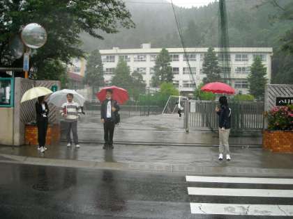 戻ってきた先生方が校門指導に立ってくれて賑やかに挨拶を交わしています。