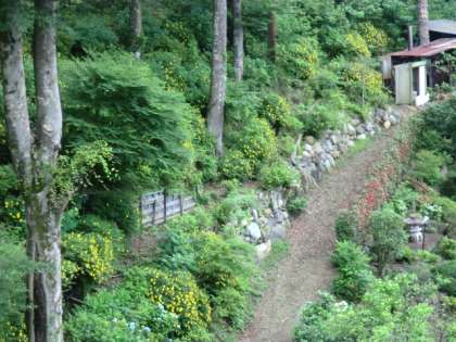 梅雨空の下で、ヤマブキの黄色い色がめに飛び込んできました。