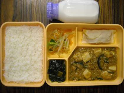 ごはん・マーボーナス豆腐・ツナポテトの棒餃子・野菜のペッパーソテー・