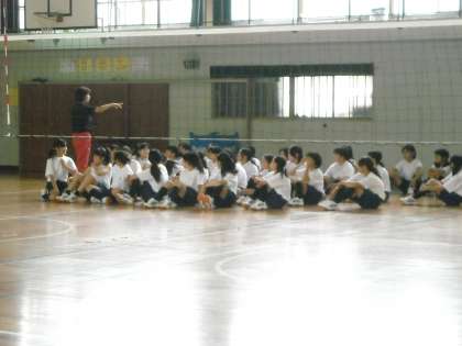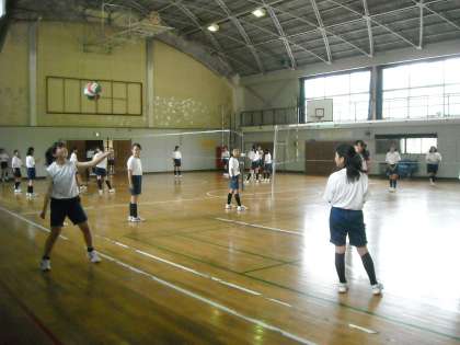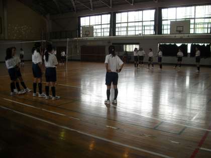 女子は体育館でバレーボールの練習です。試合形式の始まりでした。