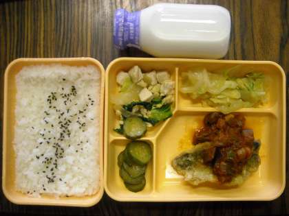 ごまごはん・フライのはっちソース・キャベツの生姜風味・豆腐と卵の炒め物・