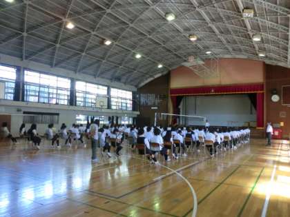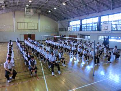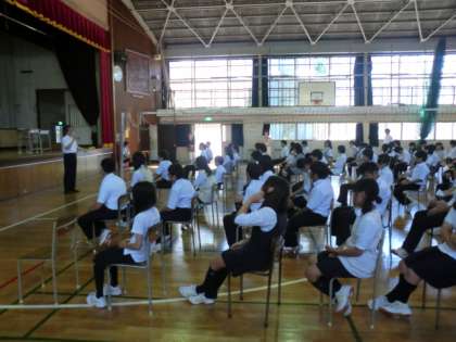 学年主任の橋本先生が、夏休みの生活について話していました。