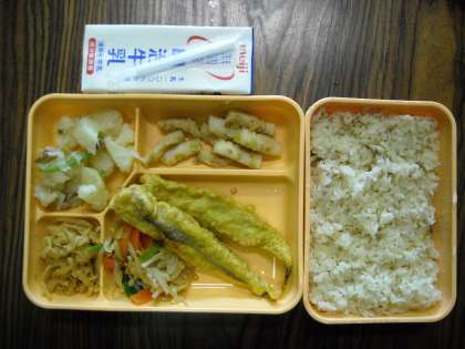 鶏そぼろごはん・ししゃものカレー天・ピーナッツ和え・イカの香味炒