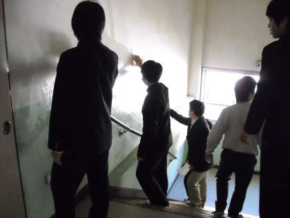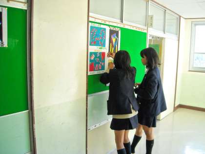2年生は美術の作品で壁面が一杯なので、階段を利用して展示しようとしましたが、恩方独特の湿気で大苦戦しています。