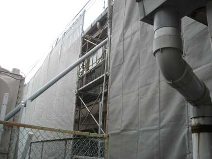 体育館も耐震工事を行いますが、ネットで外側を覆われ、コート一面ブルーシートに覆われていました。体育館の部活は恩一小や市の体育館を借りて活動を行います。