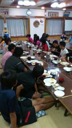 一日目の練習が終わり、みんなで夕食です。明日の朝は5時起きで朝練に出発なので、今晩は早く床につきます。
