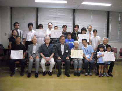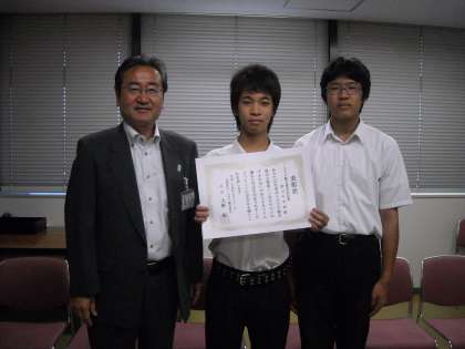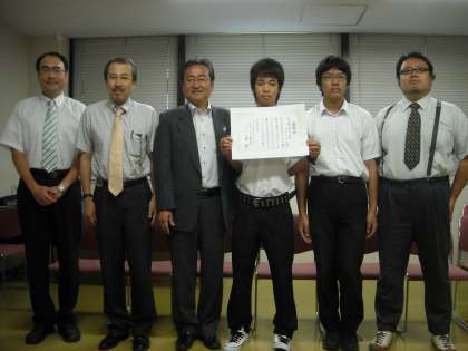 受賞後は恒例の記念撮影です。一緒に行った校長先生・馬場先生・飯野先生も石森新市長とも一緒に写真に納まりました。