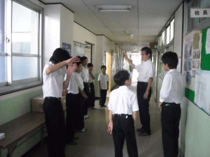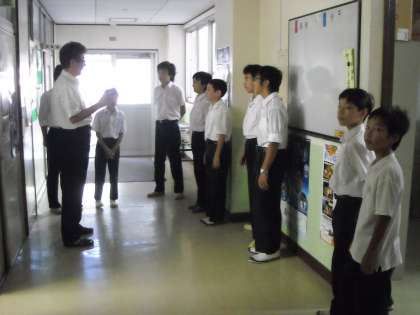 活動を始める前に職員室前で橋本先生の薫陶を受けていました。