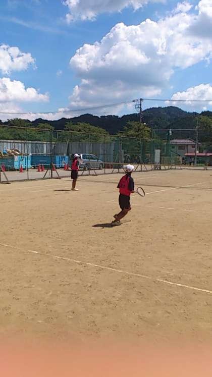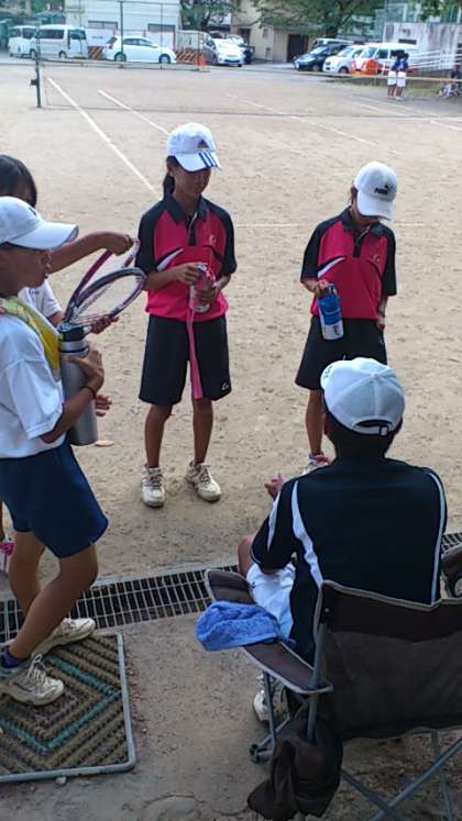 空いたコートで昨日の続きの1年生女子の準決勝が始まりました。恩方の山室・関岡組の相手は椚田中学校です。