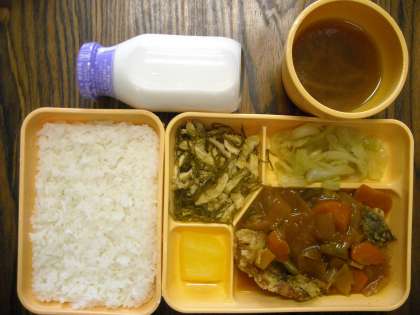 ごはん・白身魚の酢豚風・キャベツの生姜風味・クーブイリチー・中華スープ・果物
