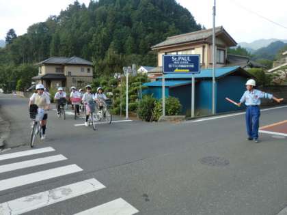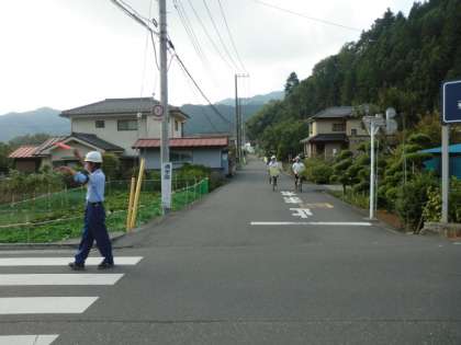 警備員さんの誘導で、陣馬街道を横断します。
