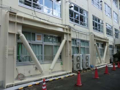 第一校舎の耐震工事の足場が昨日までに撤去され、耐震設備の全貌が明らかになりました。