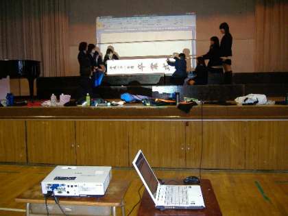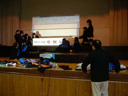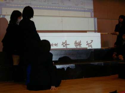 ステージ上では、バレー部が卒業式の準備のため、馬場先生の指導のもとに、看板製作をしていました。