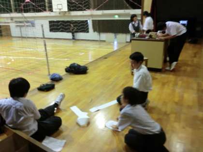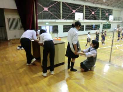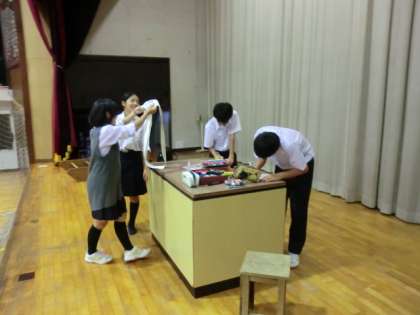 ステージの上で生徒会役員選挙の立候補者が、明日の立会演説会の準備をしていました。