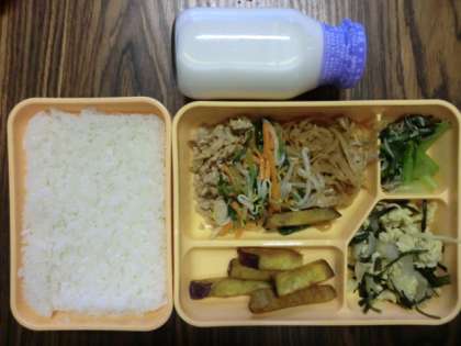 ごはん・ビビンバ・キャンディーポテト・ニラ玉炒め・青菜とじゃこの当座煮