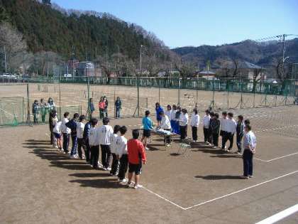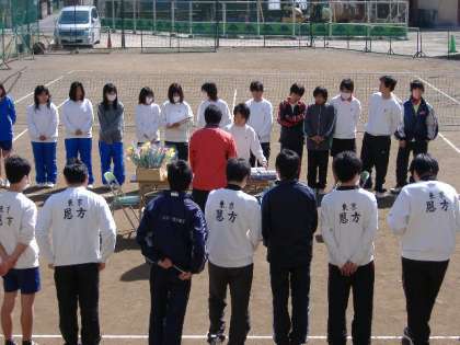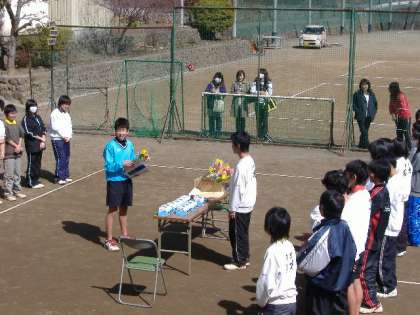 食事の後、テニスコートの上で、厳粛な中にも温かな雰囲気の中で、一人一人に記念品が手渡されました。
