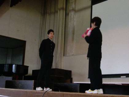 手づくりのキーホルダーが、3年生を代表とて、前生徒会長島田君に手渡されました。