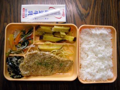 ごはん・豚肉のごま焼き・ペペロンチーノ・ボイルサラダ・さつまフレンチ