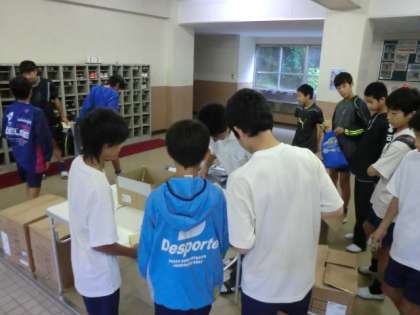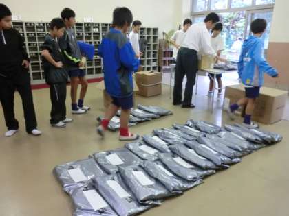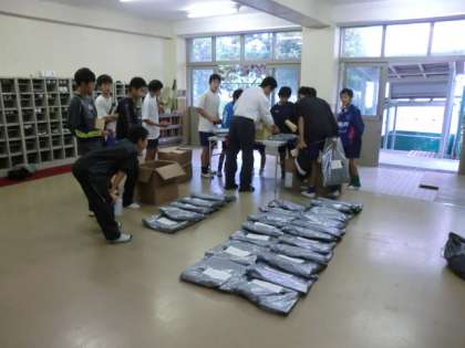 朝7時30分から1年生の生徒玄関で、体育の授業で使用する柔道着の引き渡しが行われました。