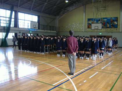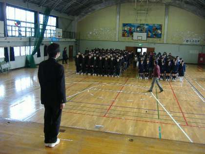 清掃後、体育館に集まって、式の歌の練習をしました。