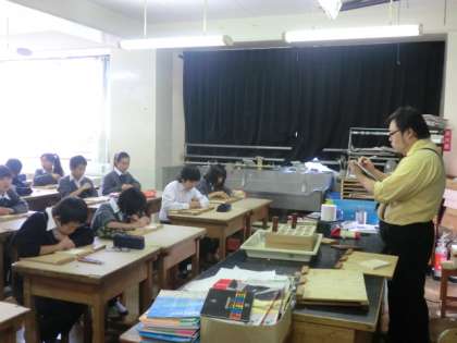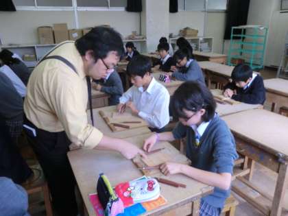 飯野先生が、彫刻刀の扱い方について指導していました。