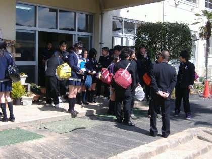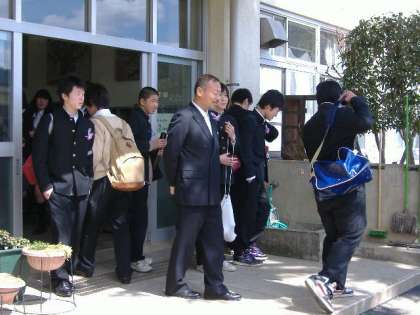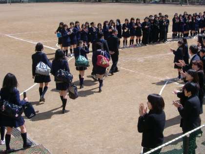 1組から順に、校庭を横切って恩方中学校に別れを告げます。