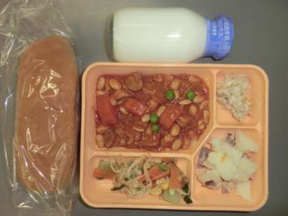 パン・ポークと豆のトマト煮込み・チンゲン菜のサラダ