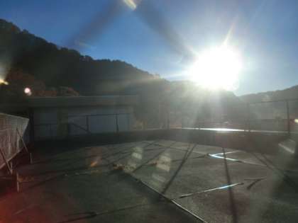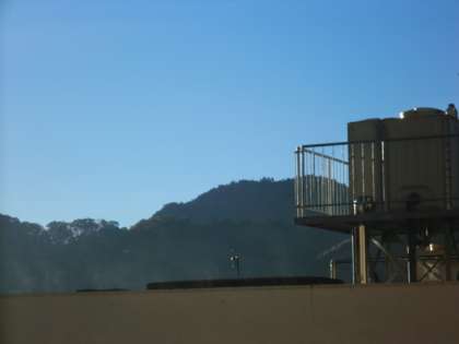 朝日に照らされて気温が上がり、屋上の雨水が湯気となって立ち登りはじめました。