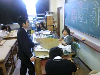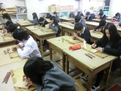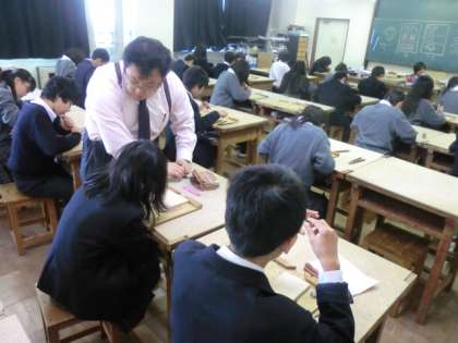 飯野先生の指導で、彫刻刀を使いかたの学習をしていました。