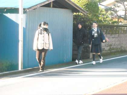 今朝のバス出勤は少なく先生2名、生徒1名です。