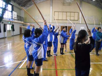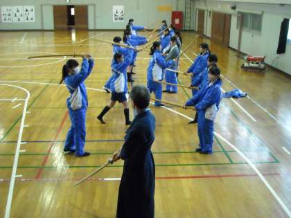 形から入ることも大切な要素です。竹刀ではなく木刀を使って交互に形を学びます。