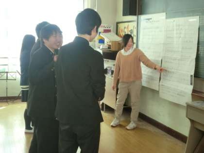 奥山先生の指導で、グループに分かれてリズムをとる練習をしていました。