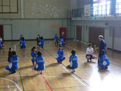 体育館で坂本先生と補助指導員の神子先生による、剣道の基礎の学習です。