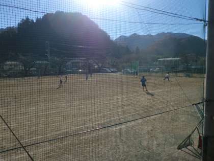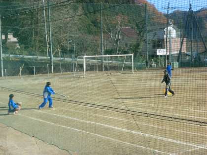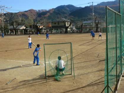 狩野先生の指導で、グラウンドでソフトボールの学習です。