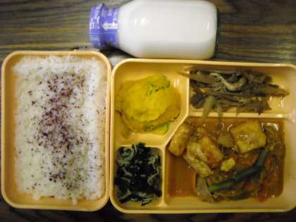 ゆかりごはん・厚揚げのカレー煮・豚肉のしぐれ煮・かぼちゃサラダ・ちりめんわかめ