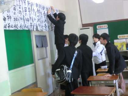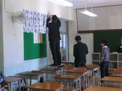 帰りの学活の後にも、3年生の係の生徒が教室に掲示を行っていました。