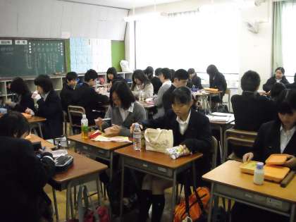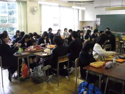 2年生1・2組の昼食風景です。班ごとに揃って食べています。