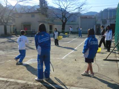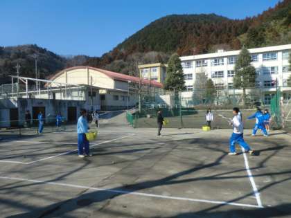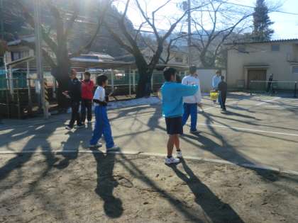 グラウンドが使えないため、駐車場のスペースを活用して練習です。