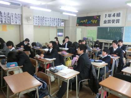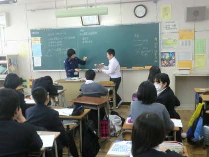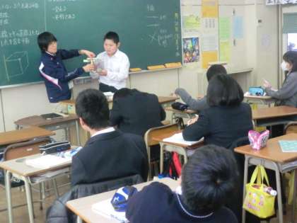 吉田先生が、生徒を助手にして立体の体積について説明していました。